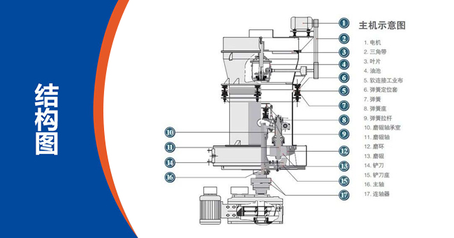 鋁礦石磨粉機內(nèi)部結構比較簡單,主要由主機、電機、鼓風機、分析機、管道裝置等幾部分組成,其中主機作為該設備的主要部件,又包括了磨輥、磨環(huán)、鏟刀、進風蝸殼、機架、罩殼等。
